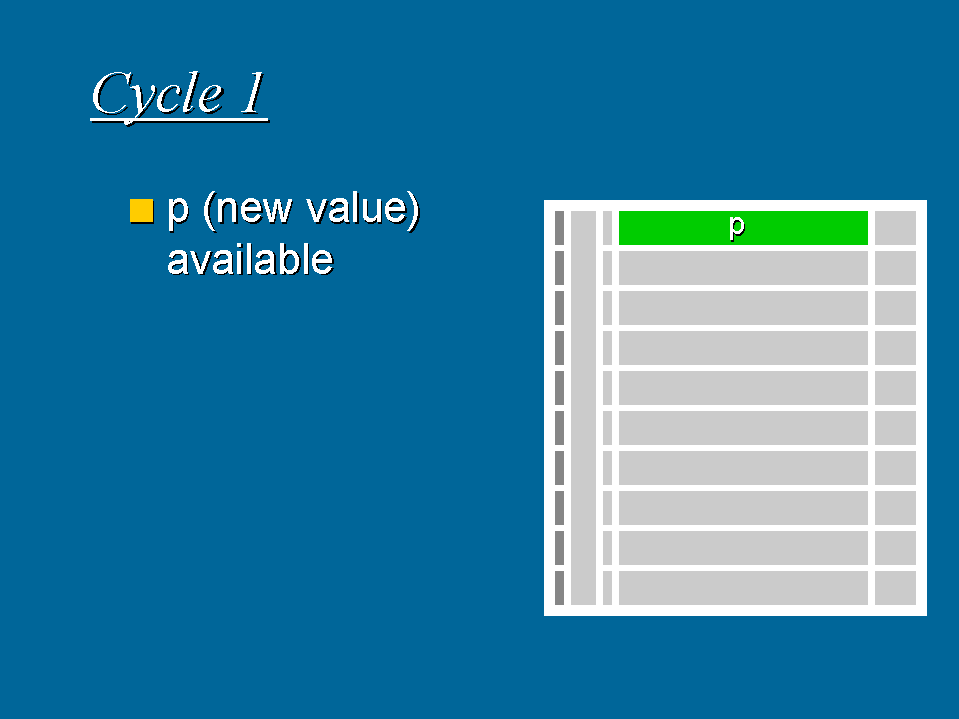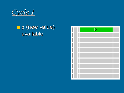 Legend: Dark green: newly computed this cycle Light green: computed in some earlier cycle, still valid Red: active control block 18